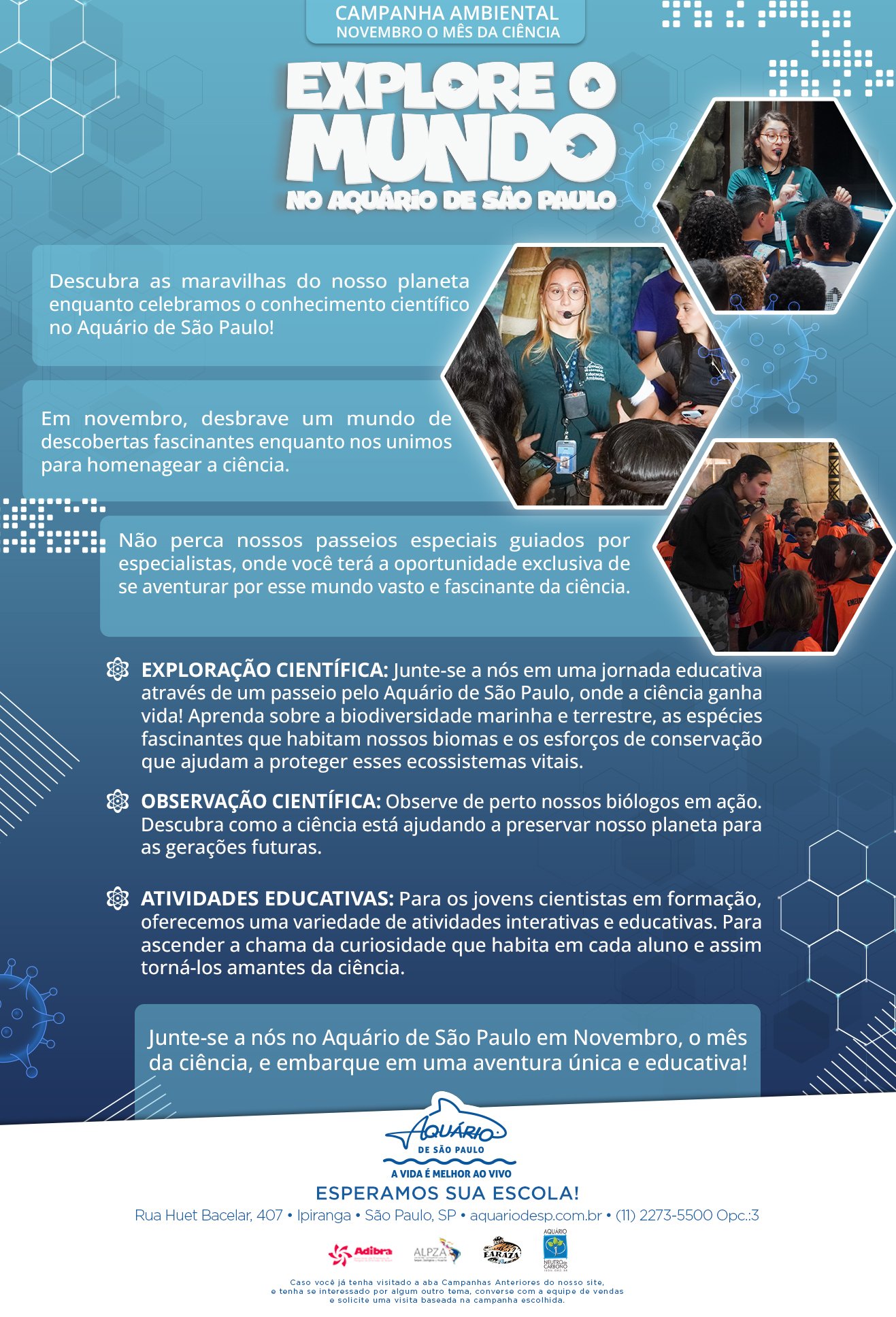 The Schools Department of the São Paulo Aquarium comprises professionals qualified to provide the best service and relevant information to schools, churches, and NGOs about visits and cultural/environmental campaigns promoted by the São Paulo Aquarium.